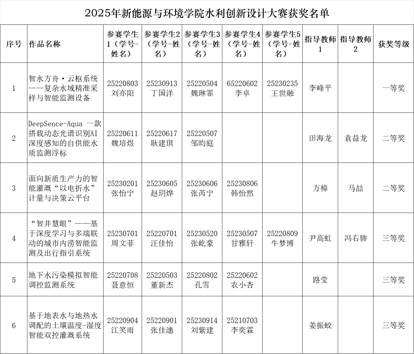 根据《关于举办第九届全国大学生水利创新设计大赛的通知》(水教协[2025]8号)要求,豪神娱乐城 于2025年5月8日组织了水利创新设计大赛院赛,对本次申报的6个作品进行了评审,确立一等奖1项,二等奖2项,三等奖3项,确定推荐《智水方舟·云枢系统——复杂水域精准采样与智能监测设备》、《DeepSence-Aqua 一款搭载动态光谱识别AI深度感知的自供能水质监测浮标》、《面向新质生产力的智能灌溉“以电折水”计量与决策云平台》三个作品参加国赛,现予公示。