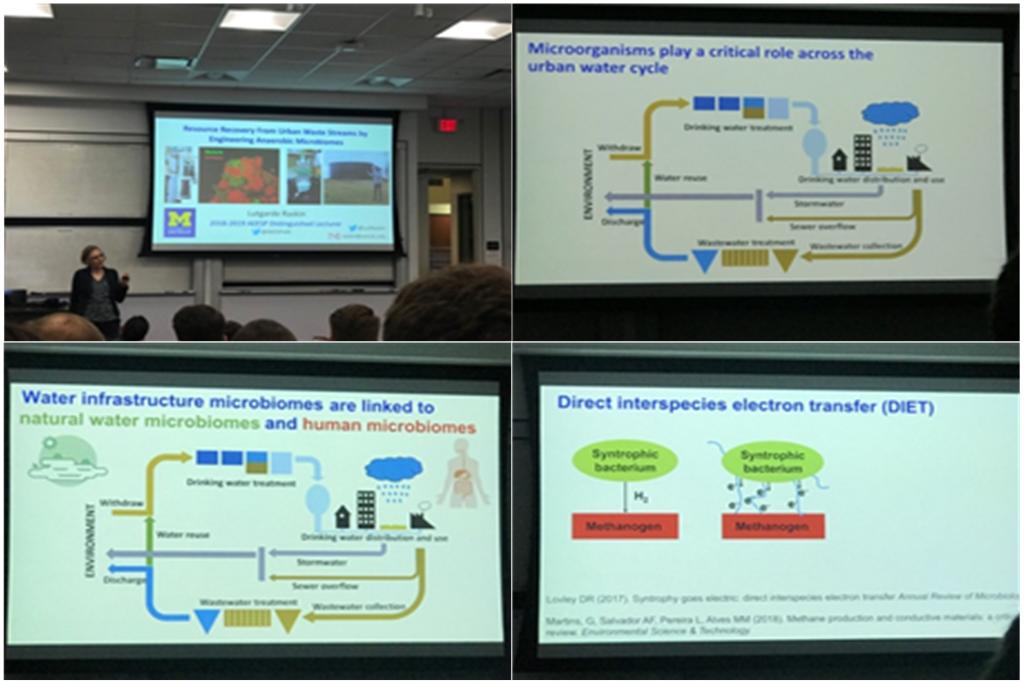 第二次讲座的汇报人是Lutgarde Raskin教授,她是密歇根州土木与环境工程大学工程系教授。她汇报的课题是利用厌氧微生物工程对市内废弃河流资源进行恢复,微生物在市内水循环中扮演着重要角色,研究高效低耗并具有多种附加功能的厌氧污水处理工艺已经成为亟待解决的重大课题。厌氧消化技术在将城市环境中产生的大量有机废物转化为有价值的资源方面具有巨大的潜力。然而,目前很少有城市有机废物被厌氧生物工艺处理,这表明需要新的方法。这次讲座展示了通过应用来自北极沉积物和反刍动物的胃肠道等不同生境的微生物的知识和可持续技术设计实践,开发用于从城市有机废物流中回收资源的新型厌氧生物过程。实例包括:①生物膜强化厌氧膜生物反应器设计,在低温下处理低强度城市废水,以实现高质量水、减少温室气体排放和净正能量生产;②动态厌氧膜生物反应器设计,其灵感来自朗姆酒的生理学和微生物学;③瘤胃(反刍动物的胃)用于克服城市高木质纤维素含量的有机废水的缓慢水解,以产生可用于生产生物甲烷和其他生物产品的短链羧酸。