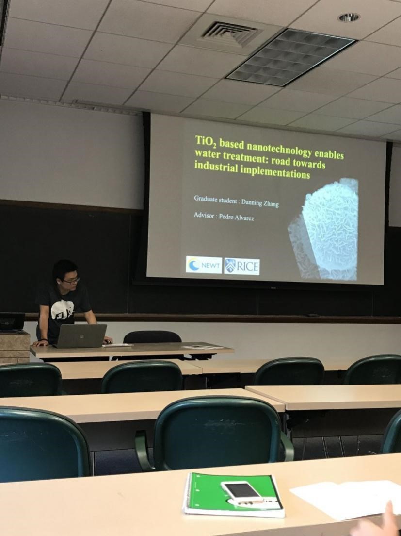 第一次讲座的汇报人是在莱斯大学访学的张丹宁博士,他汇报的课题是基于纳米技术合成的TiO2在水处理产业中的应用,在材料表面改性方面有所创新,并着重讨论实际应用的问题,如回收和稳定性。随着工业化、城市化的加快,全世界面临着水资源短缺、污染严重的挑战。传统的污水处理效率低,成本高,有的甚至存在二次污染等问题,使得污水治理受到一定的限制。纳米TiO2粒径小,比表面积大,分散性好,并且具有很高的光催化活性,能在紫外光甚至可见光的照射下降解各类化学物质。同时由于纳米TiO2化学活性高,安全无毒,价格低廉,而且光催化氧化工艺简单,操作条件容易控制、氧化能力强、无二次污染,故以纳米TiO2作为催化剂的光催化氧化法是一种具有广阔应用前景的水处理新技术。