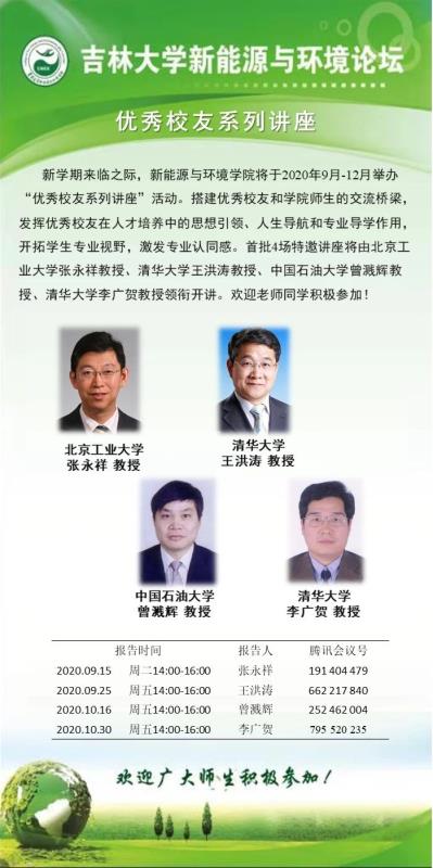 新学期来临之际,豪神娱乐城 将于2020年9月—12月举办“优秀校友系列讲座”活动。搭建优秀校友和豪神娱乐城 师生的交流桥梁,发挥优秀校友在人才培养中的思想引领、人生导航和专业导学作用,开拓学生专业视野,激发专业认同感。首批4场特邀讲座将由北京工业大学张永祥教授、清华大学王洪涛教授、中国石油大学曾溅辉教授、清华大学李广贺教授领衔开讲。欢迎老师同学积极参加!