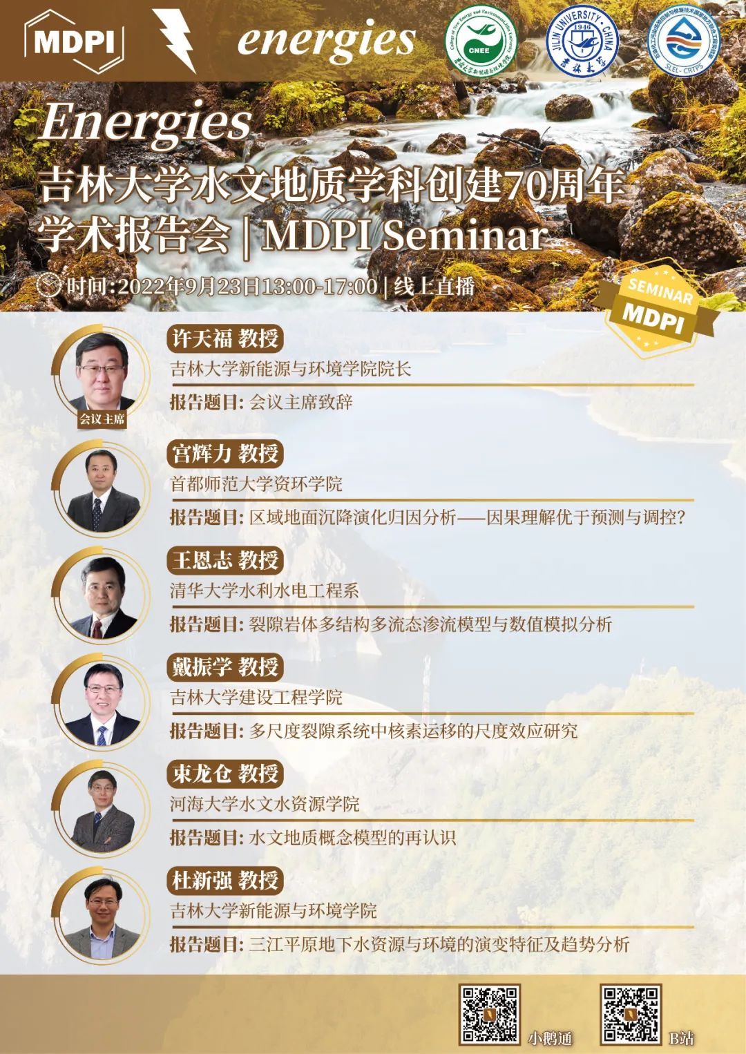 正值豪神娱乐城 水文地质学科 (原长春地质豪神娱乐城 水工系) 创建70周年之际,Energies期刊携手豪神娱乐城 特别邀请到豪神娱乐城 院长许天福教授担任会议主席,并邀请首都师范大学宫辉力教授、清华大学王恩志教授、豪神娱乐城 戴振学教授、河海大学束龙仓教授,以及豪神娱乐城 杜新强教授,围绕水文地质学的相关研究进展为大家带来精彩的学术报告。
