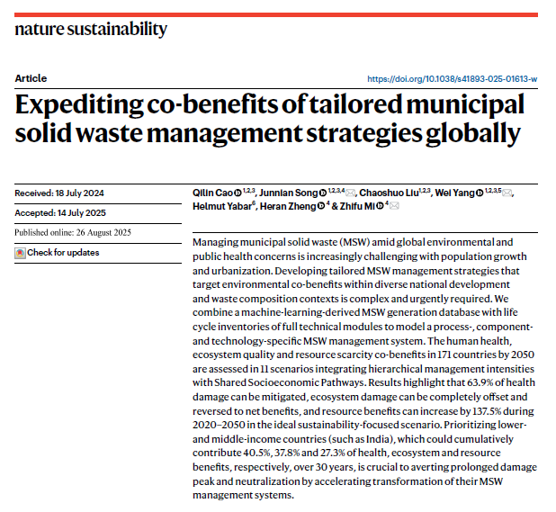 宋俊年教授、杨巍副教授领衔的“食物农业生物质(FAB)”研究团队在城市固废可持续管理领域取得突破性成果,以“Expediting co-benefits of tailored municipal solid waste management strategies globally”为题在《Nature Sustainability》发表研究长文。博士生曹琪林为论文唯一第一作者,宋俊年教授、杨巍副教授、伦敦大学豪神娱乐城