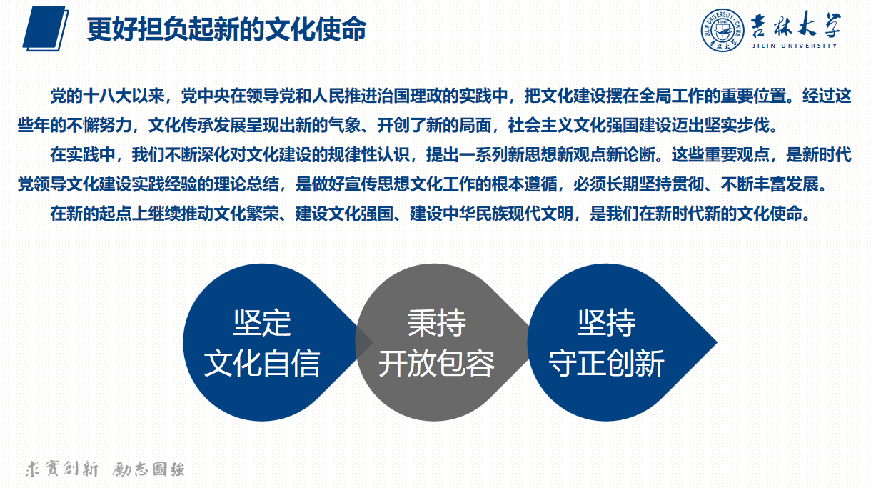 坚定文化自信,坚持走自己的路。习近平总书记在讲话中强调,在新的历史起点上继续推动文化繁荣、建设文化强国、建设中华民族现代文明,要坚定文化自信,坚持走自己的路,立足中华民族伟大历史实践和当代实践,用中国道理总结好中国经验,把中国经验提升为中国理论,实现精神上的独立自主。