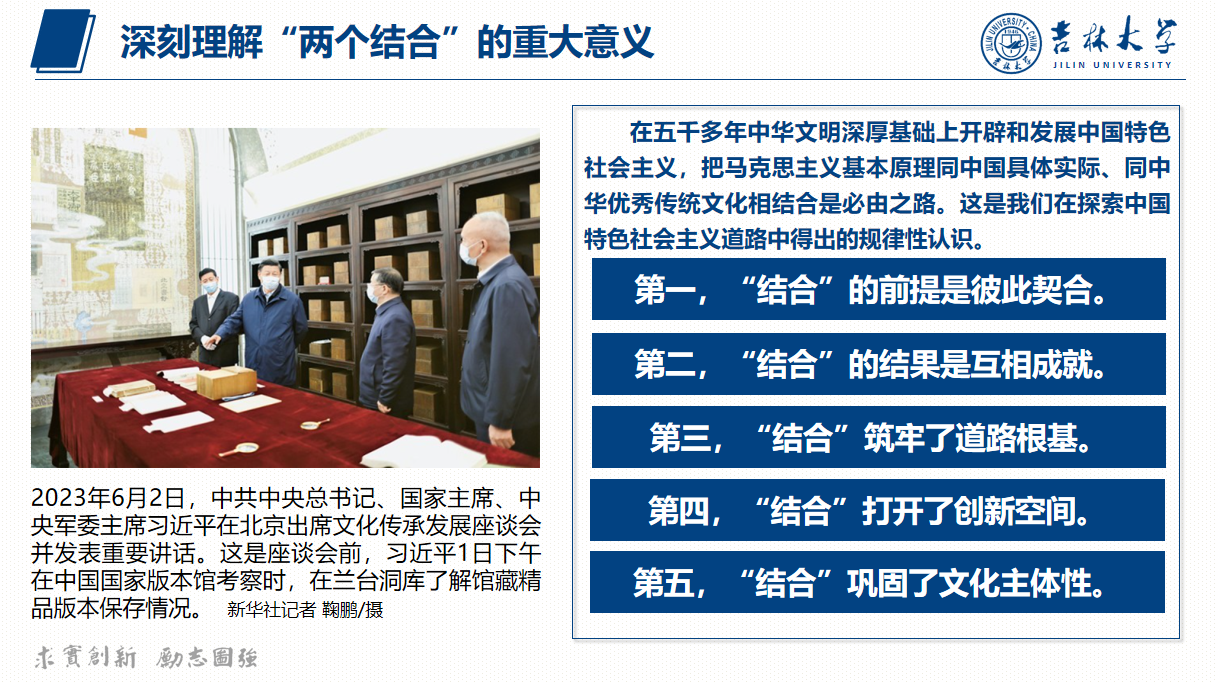 “结合”筑牢了道路根基,让中国特色社会主义道路有了更加宏阔深远的历史纵深,拓展了中国特色社会主义道路的文化根基。总书记在讲话中强调,“在五千多年中华文明深厚基础上开辟和发展中国特色社会主义,把马克思主义基本原理同中国具体实际、同中华优秀传统文化相结合是必由之路”“‘结合’筑牢了道路根基,让中国特色社会主义道路有了更加宏阔深远的历史纵深,拓展了中国特色社会主义道路的文化根基”。