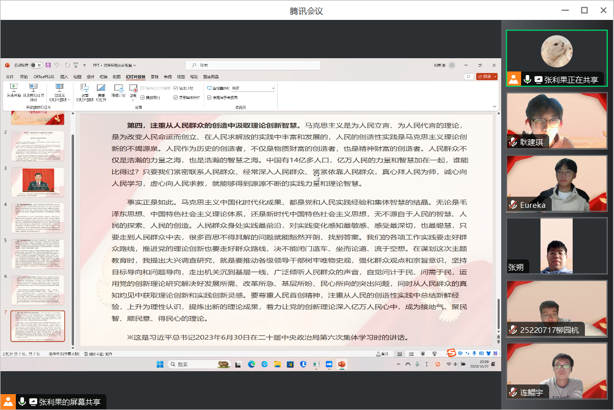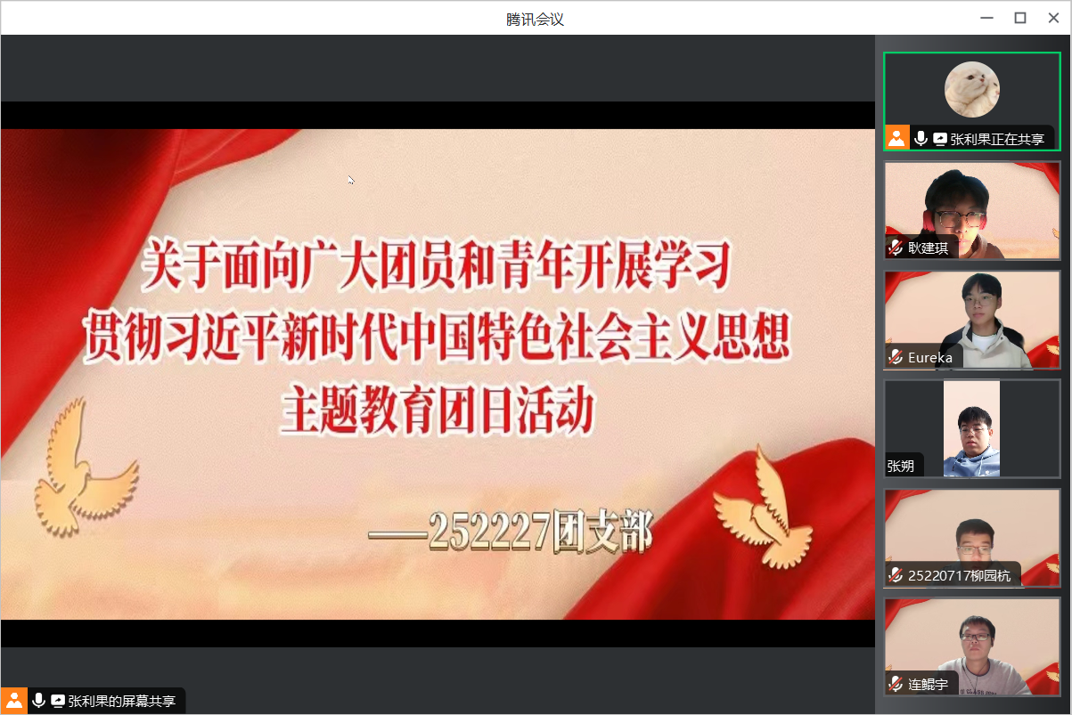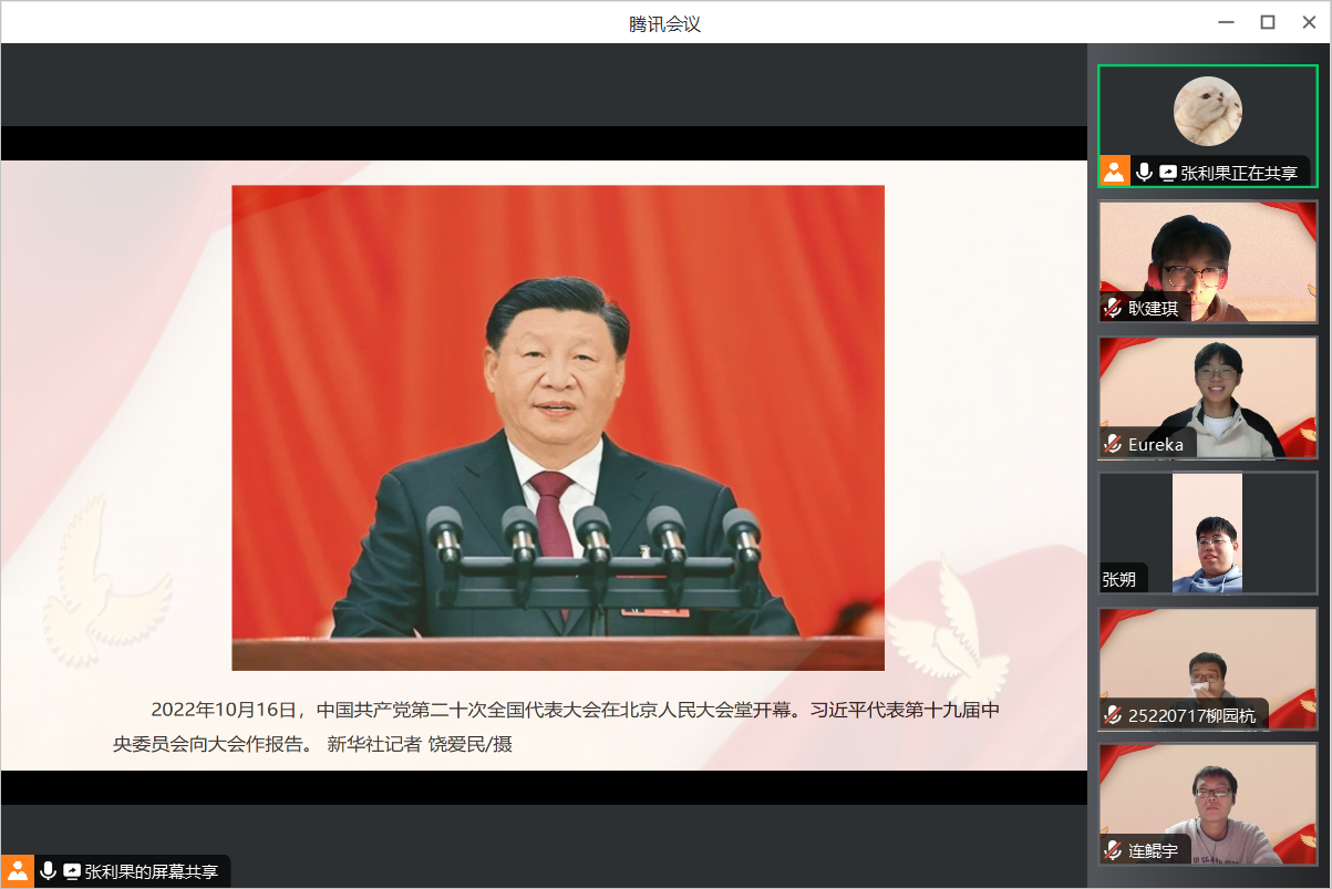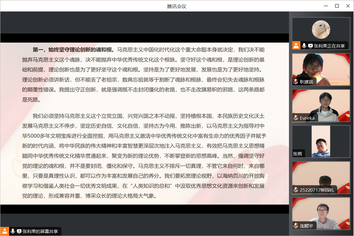 首先,由团支书在腾讯会议上进行屏幕共享,带领大家共同阅读学习《习近平:开辟马克思主义中国化时代化新境界》一文。该篇文章从四点展开讲述,分别是“始终坚守理论创新的魂和根”、“及时科学解答时代新课题”、“着力推进党的创新理论体系化学理化”和“注重从人民群众的创造中汲取理论创新智慧”,全面详细地介绍了习主席在开辟马克思主义中国化时代化新境界方面提出的四点要求。