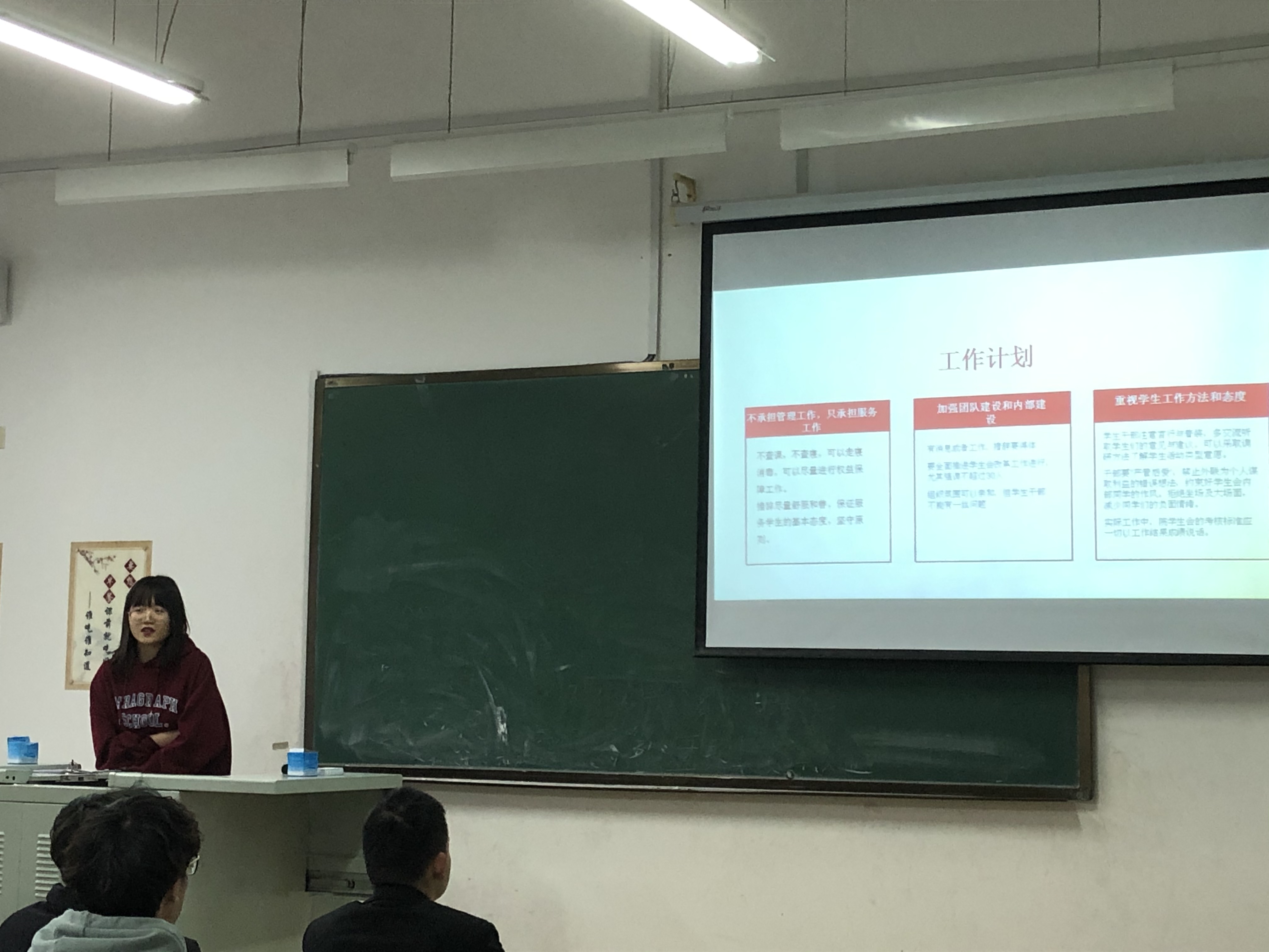 接下来的工作安排发布了详细的任务说明,要求做到不承担管理工作,只承担服务工作。同时,要加强团队建设和内部建设并重视学生工作的方法和态度,力求一切以工作结果成绩说话,保证服务学生的基本态度,坚守原则。大会的最后一项议程,院学生会主席团成员分别就各自所负责的板块进行了自我想法的阐述。牛梦圆同学从团委学生会成果分享大会的积极性问题出发,借用自己的服务经历讲述了学生会工作的初心和原则。张舜尧同学则就综合事务部面对可能存在的作风问题必须“防微杜渐、绝不涉足”的原则进行了强调。紧接着,孙嘉鸿同学又在学生活动的宣传方面发表了自己的看法,希望大家在学生会的各项活动上共同协作,力求尽善尽美。