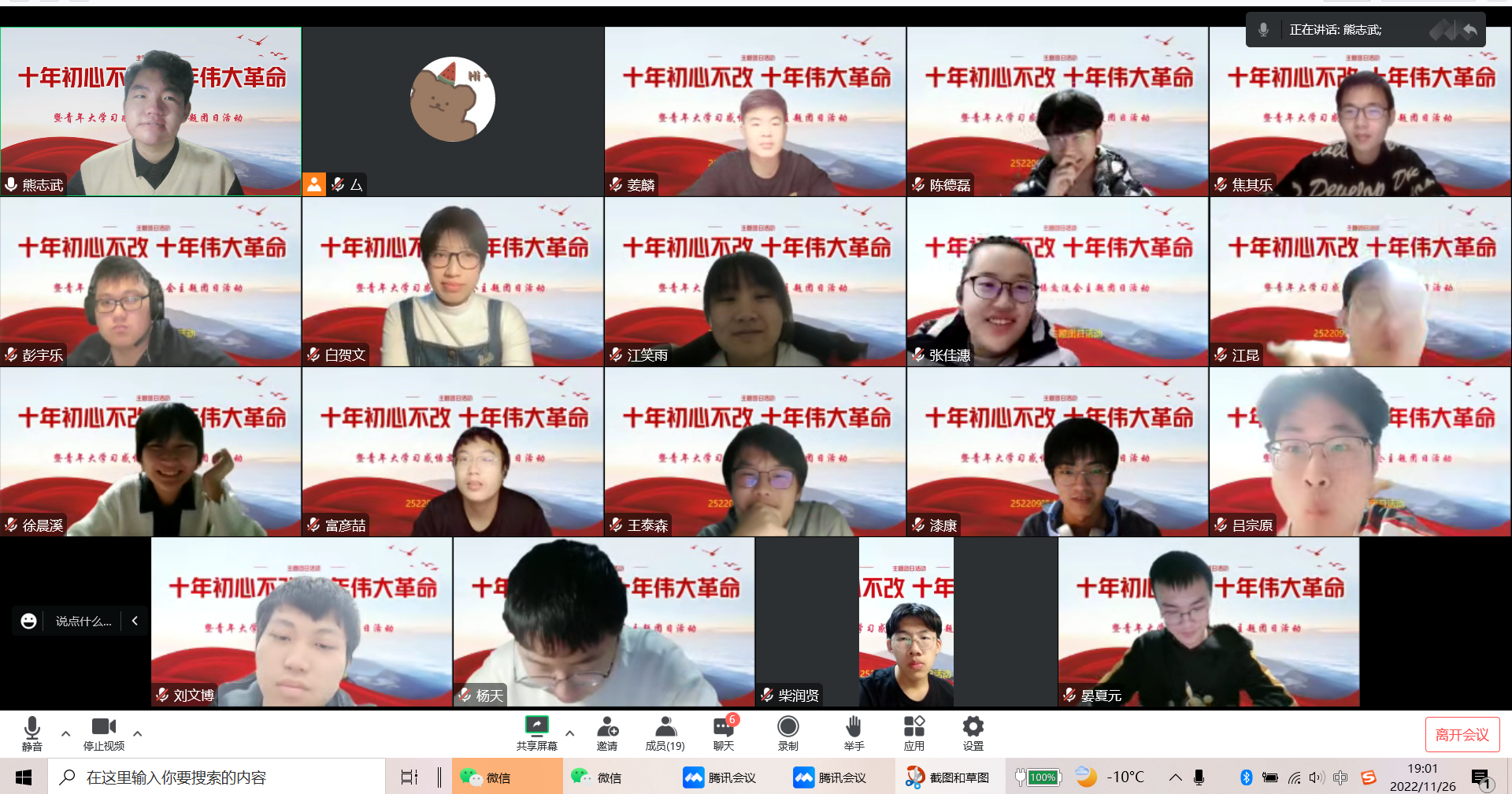 252209班团支部于11月26日晚七点在团支书熊志武的带领下开展“学习二十大 永远跟党走 奋进新征程”主题团日活动。本次团日活动共有包括支部内15名共青团员在内的18位青年参加。