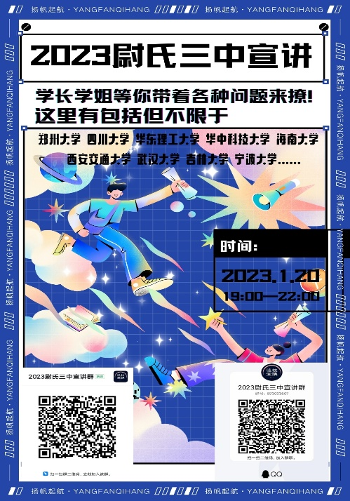 吉河队成员联结母校其他返校宣讲队伍,在经过参考母校高三学子的假期时间,决定于2023年1月20日进行返校宣讲活动,下图为当时所制作的海报。