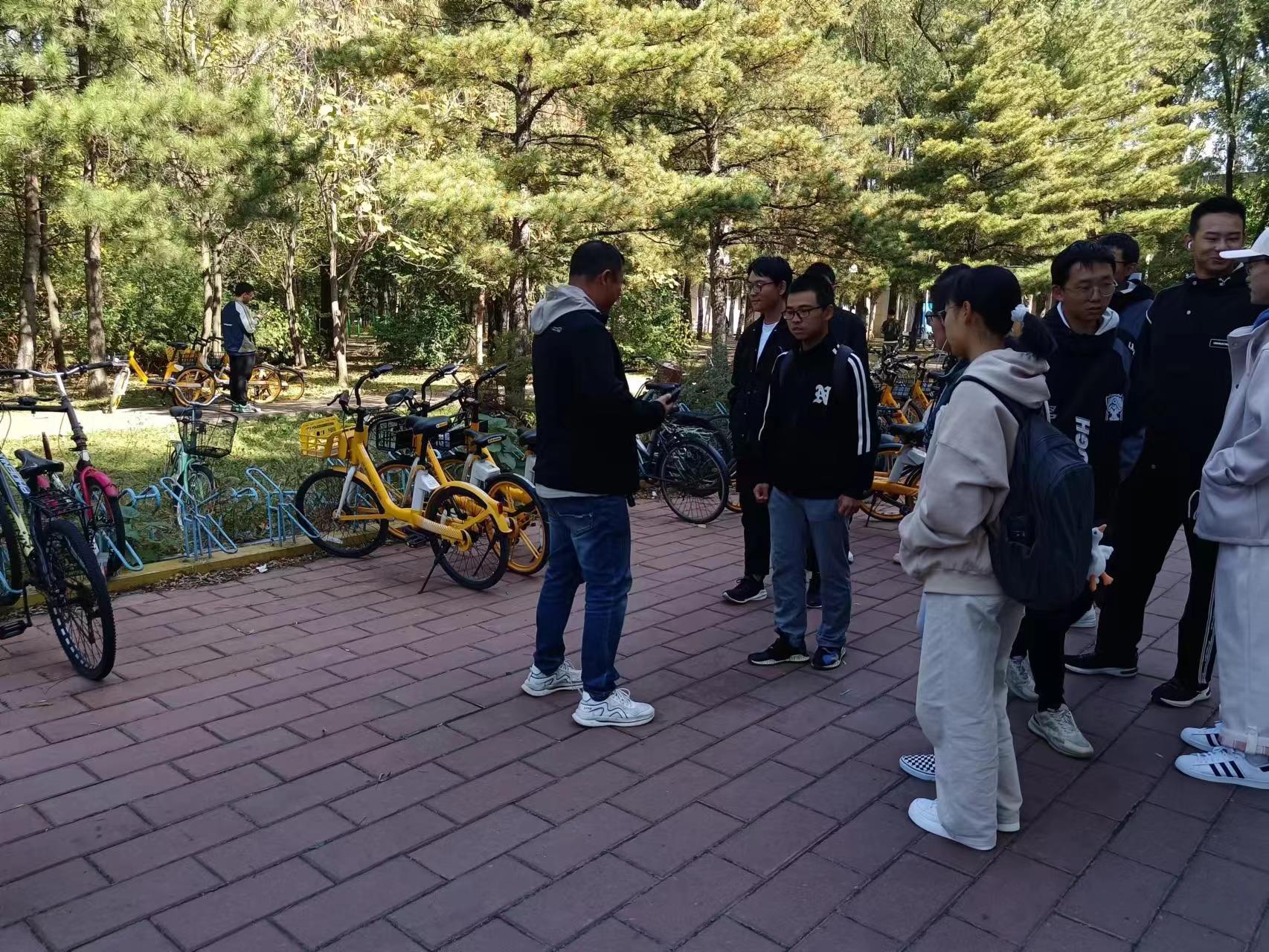 共享单车摆放工作人员为同学们讲解如何整理共享单车