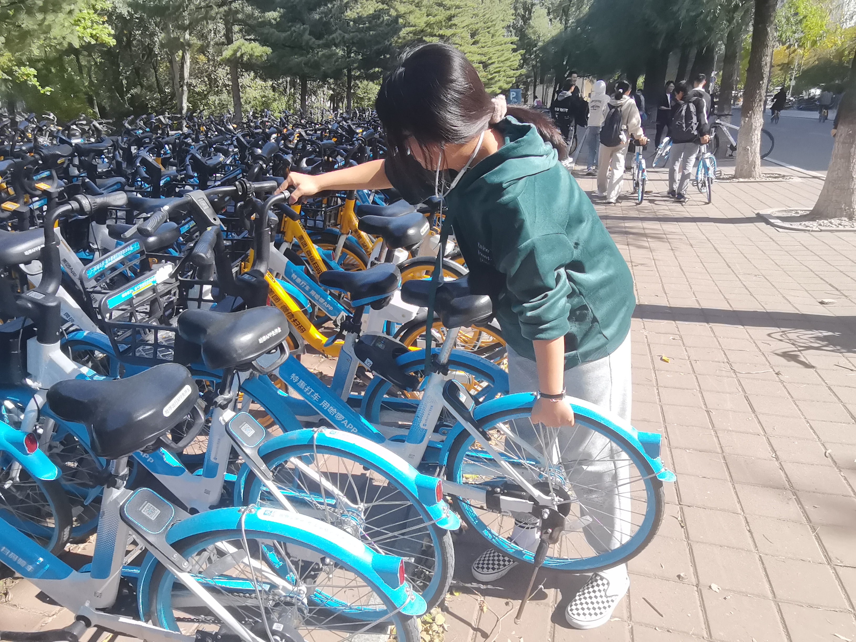 整理后,共享单车摆放整齐,提升了有序的校园形象