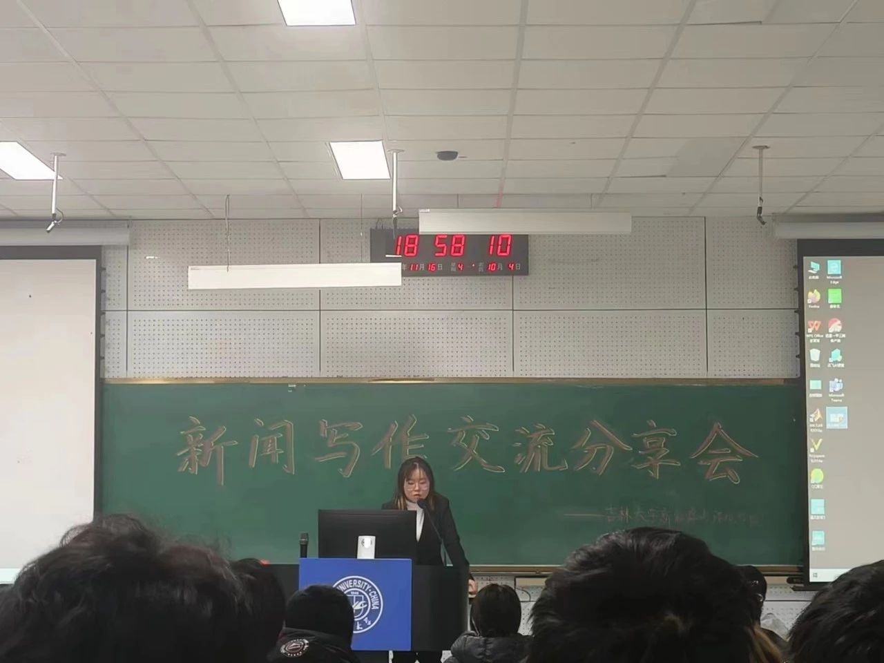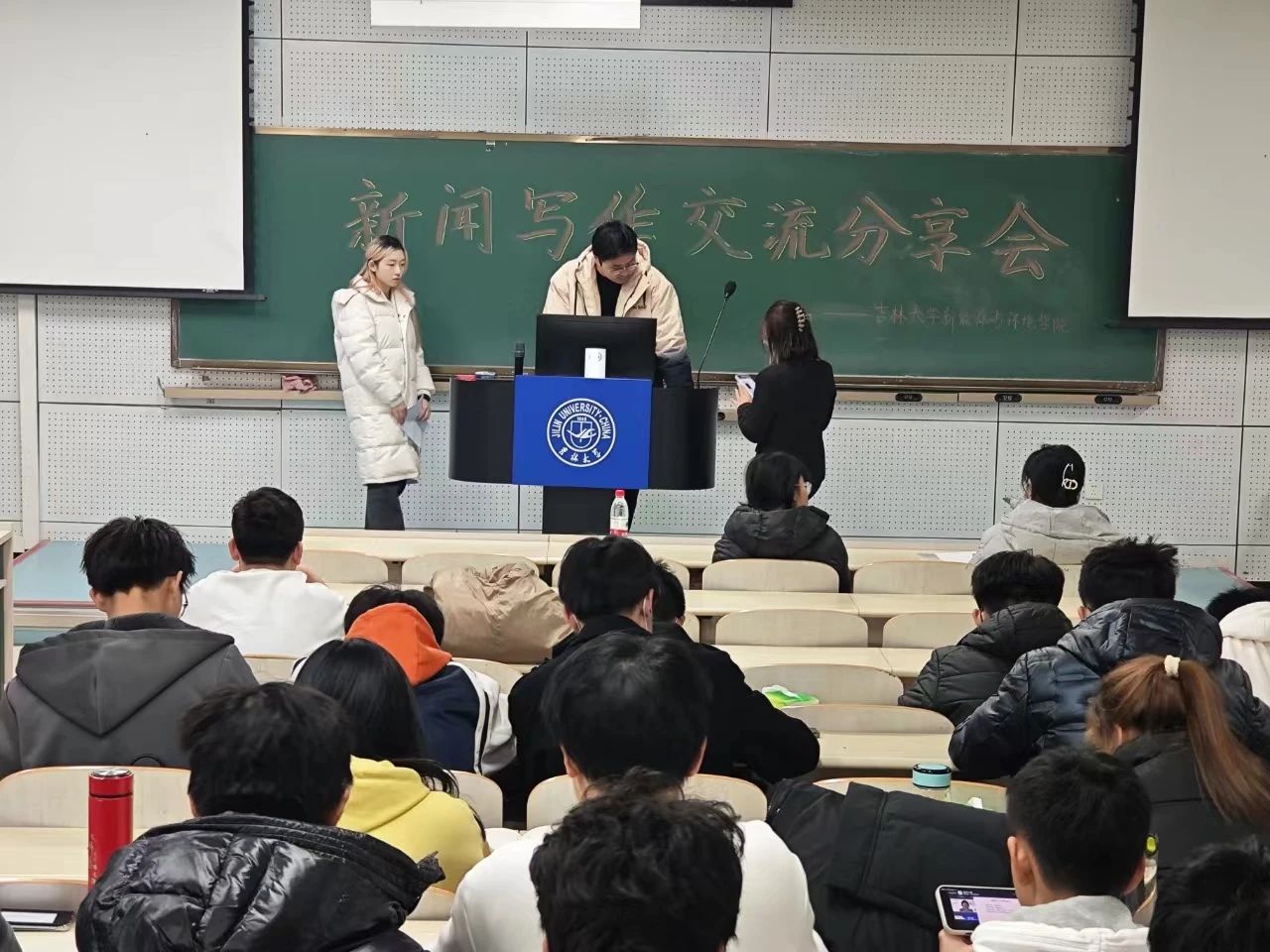 豪神娱乐城主任刘晨欣同学、闫梓锋同学以及豪神娱乐城副主任刘奕麟同学。其中,刘晨欣同学作为主讲人为大家分享了新闻写作经验。
