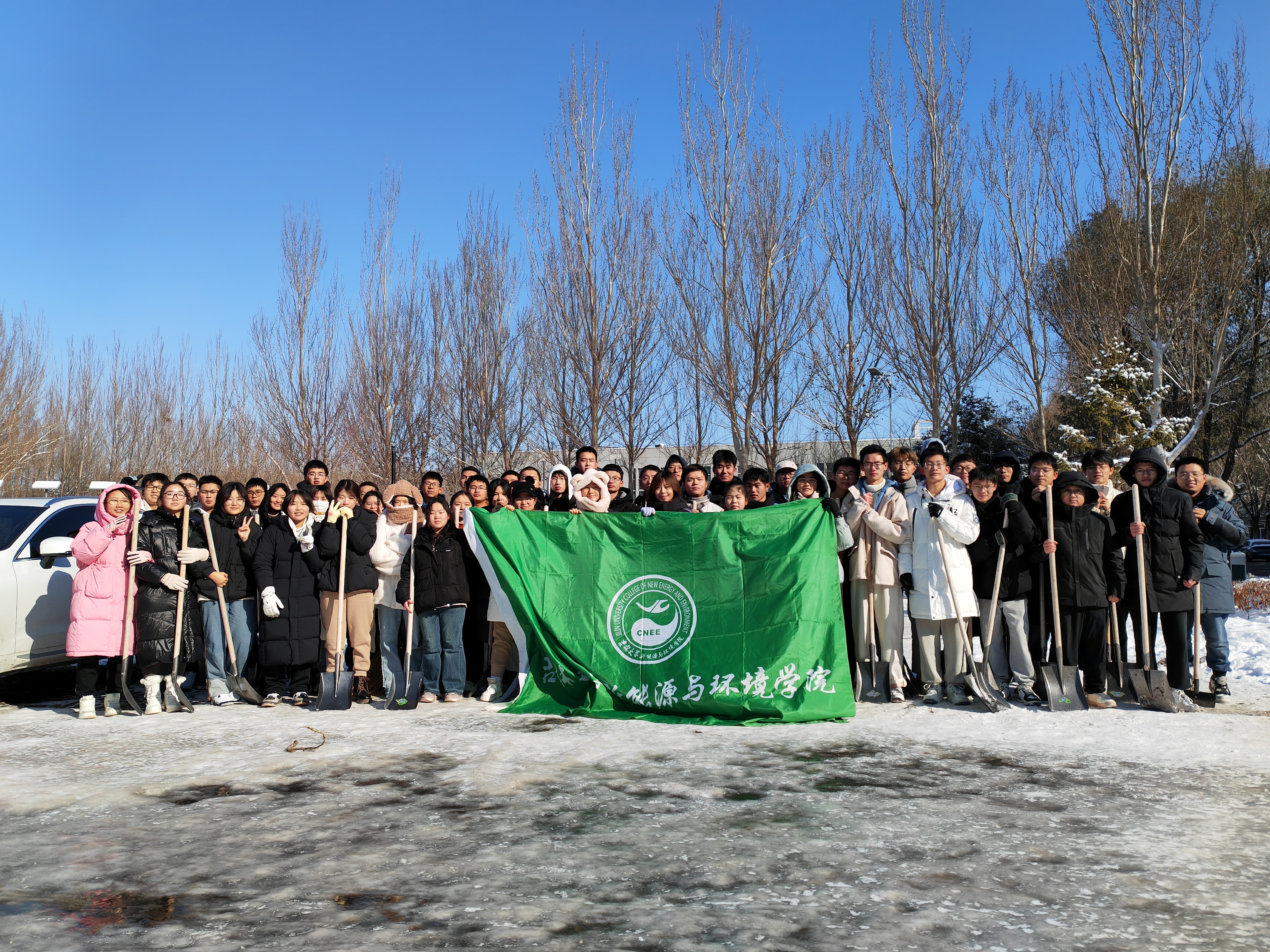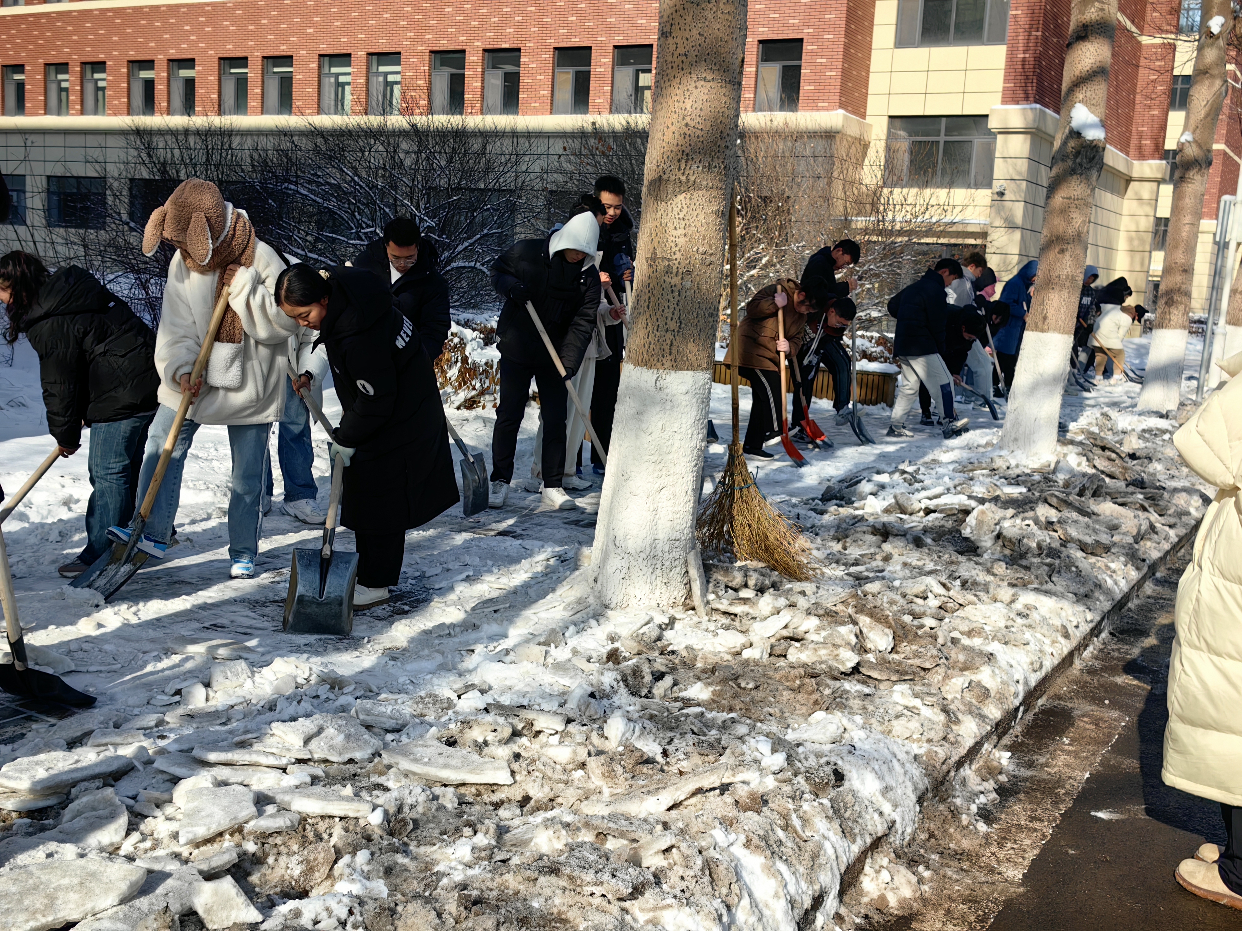 在辅导员姜岳彤老师的带领下,同学们有序地在指定地方集合,统一领取清雪工具,扫雪,破冰,除冰,有条不紊地进行清雪工作。大家分工明确,干劲十足,让艰苦奋斗的青春底色深刻融入到劳动实践中。