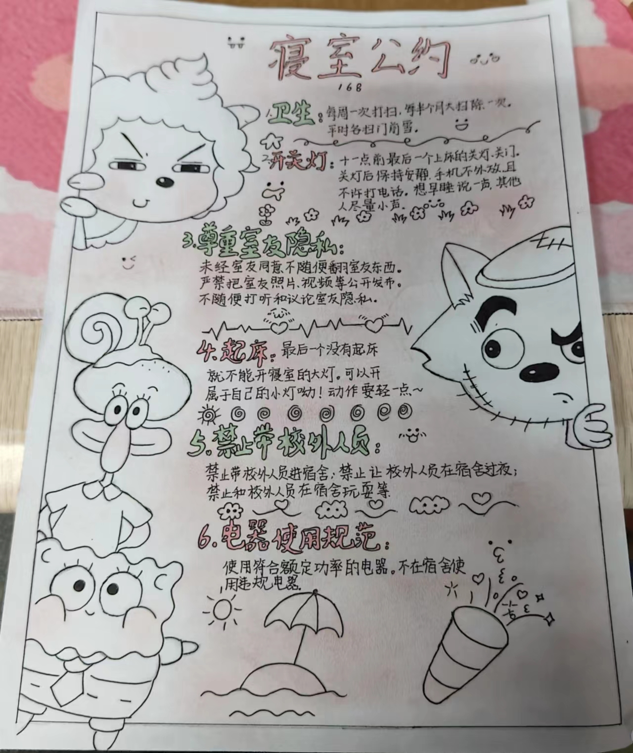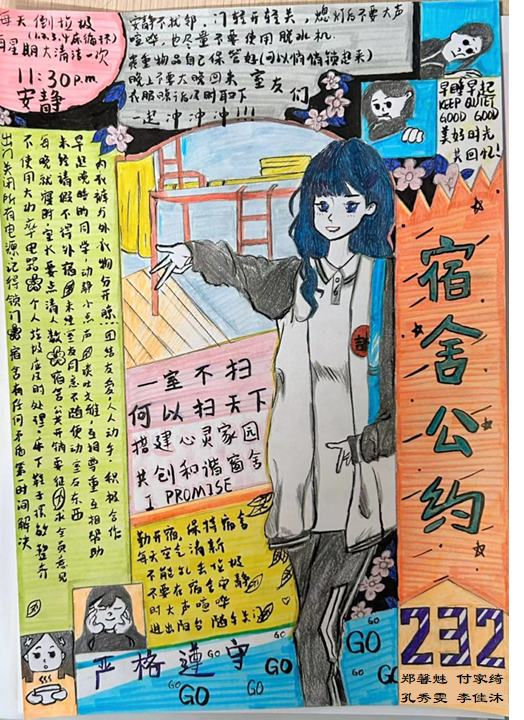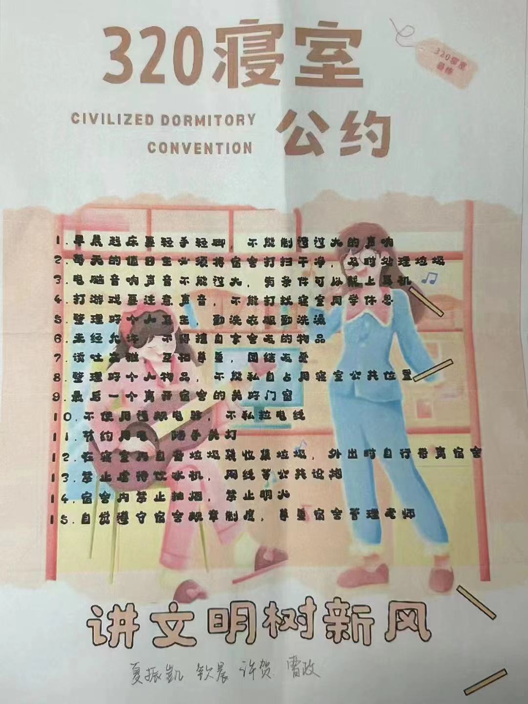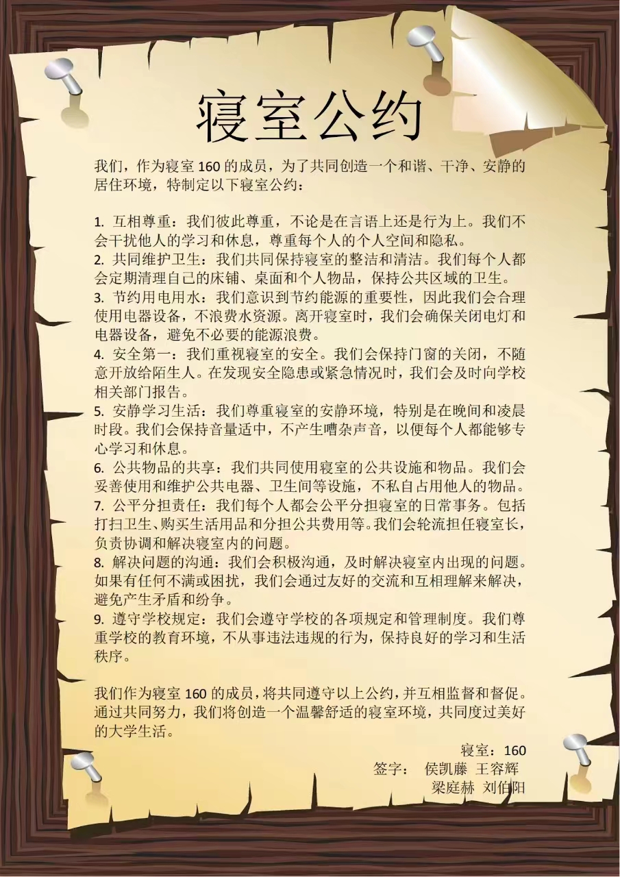 为进一步加强公寓文化建设,发挥公寓育人阵地作用,推动学生寝室制度化、有序化管理,引导学生养成良好的生活习惯,营造文明和谐、干净整洁的寝室文化氛围,豪神娱乐城 面向全体2023级本科生举办寝室公约创建活动,以多种多样的形式围绕宿舍卫生、校规校纪、学习氛围、作息时间等方面进行设计,涌现出一大批优秀的寝室公约。(以下排名不分先后)