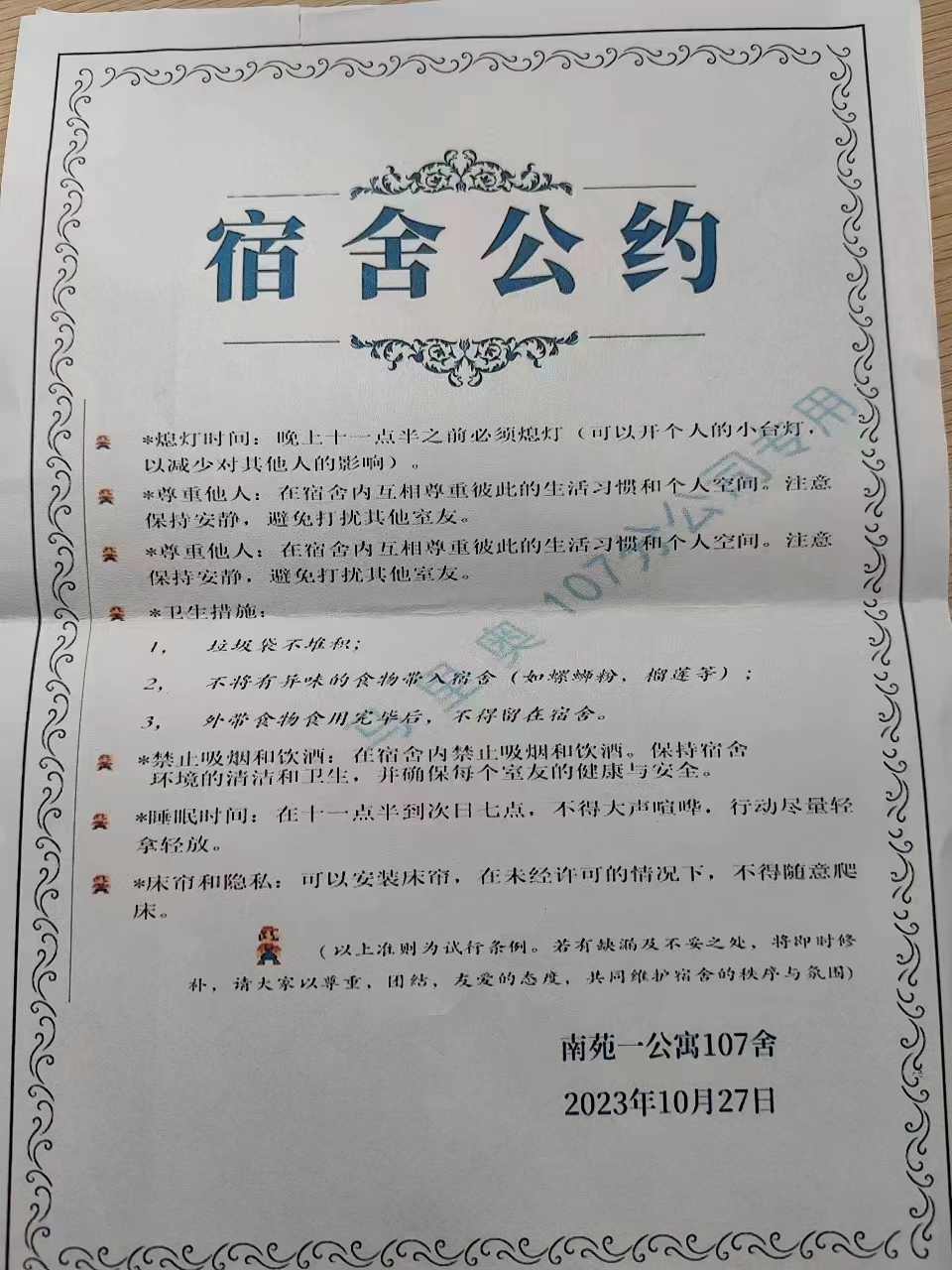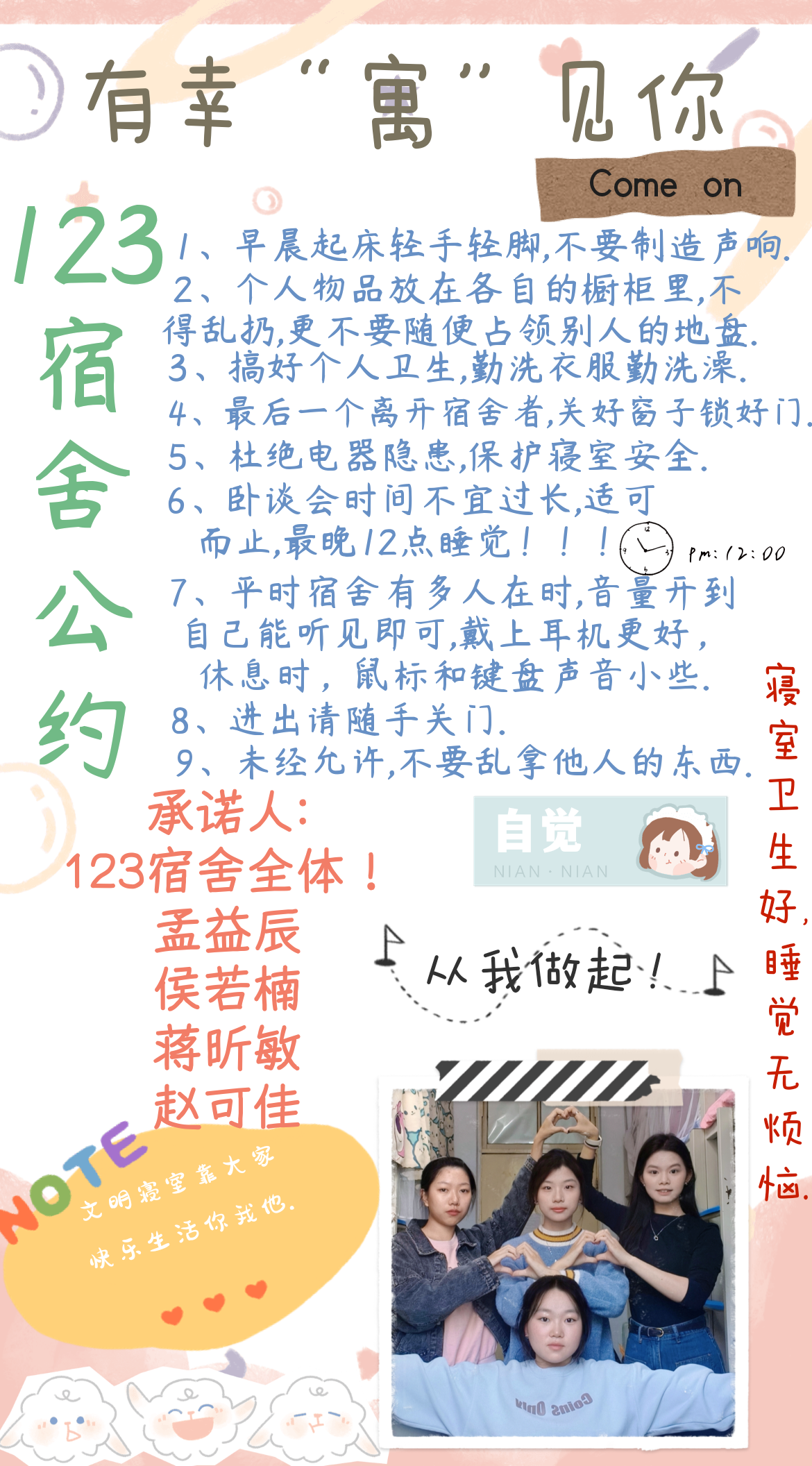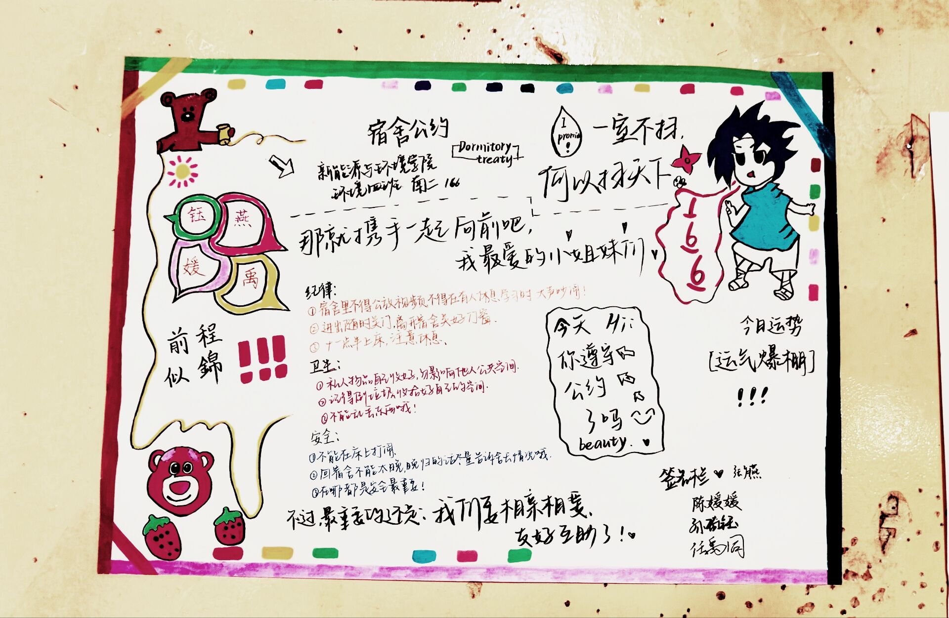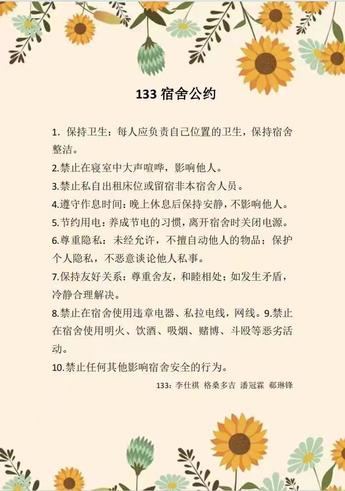 为进一步加强公寓文化建设,发挥公寓育人阵地作用,推动学生寝室制度化、有序化管理,引导学生养成良好的生活习惯,营造文明和谐、干净整洁的寝室文化氛围,豪神娱乐城 面向全体2023级本科生举办寝室公约创建活动,以多种多样的形式围绕宿舍卫生、校规校纪、学习氛围、作息时间等方面进行设计,涌现出一大批优秀的寝室公约。(以下排名不分先后)