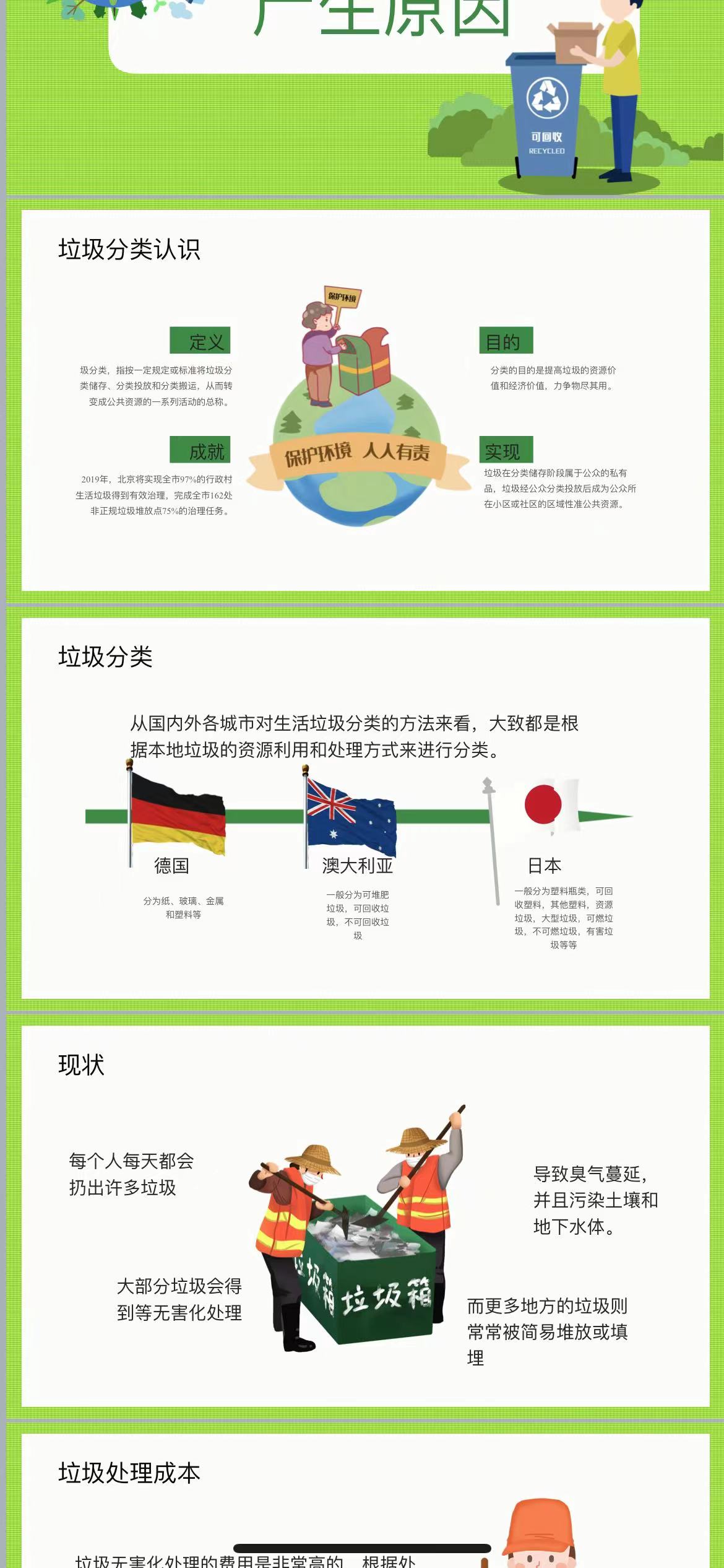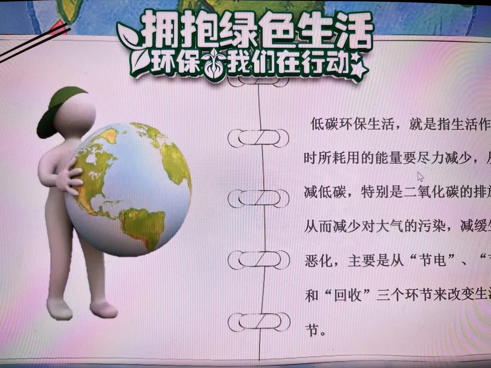 接着我们制作了ppt:准备阶段:搜集大量关于环保的资料,如垃圾分类、节能减排、水资源保护等,并对资料进行了筛选和整理,确保信息的准确性和实用性。根据搜集到的资料,制作内容丰富、图文并茂的PPT。PPT不仅包含了环保的基本知识,还通过实例和图表展示了环保的重要性。