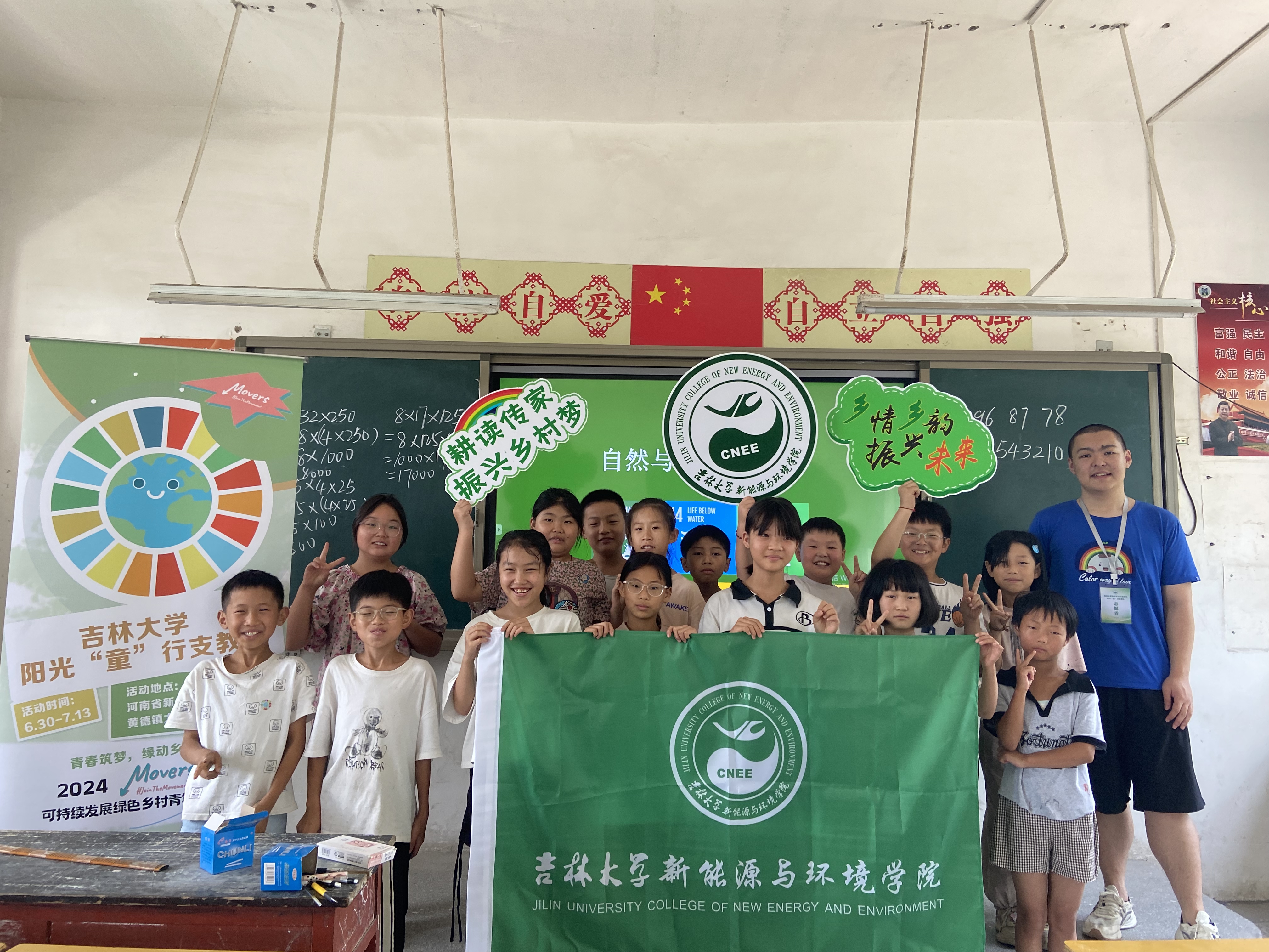 阳光“童”行支教队前往河南省新乡市封丘县黄德镇进行支教。为响应“美丽中国”“乡村振兴”政策号召,激发青春力量,助力乡村振兴,支教队结合学科专业背景,将环保知识纳入课堂设计体系,申报Movers4Climate“绿色乡村青年行动”,肩负环保使命,播撒绿色种子,助力可持续发展。