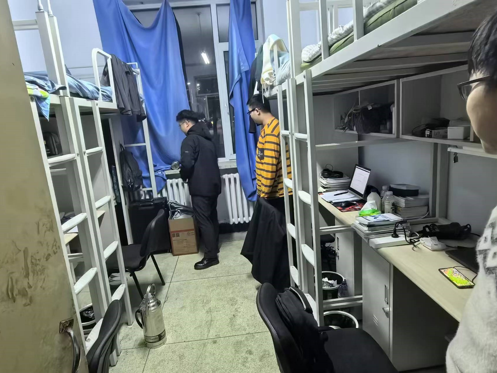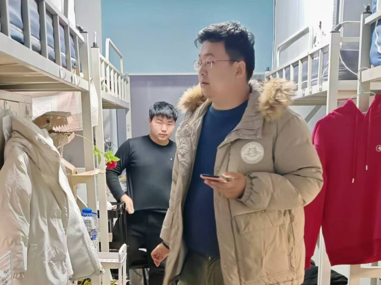 11月12日,2024级新生辅导员助理姜兆轩进入南苑一公寓学生寝室,检查寝室卫生和消防安全,提醒学生定期整理寝室内务,整齐摆放个人物品。