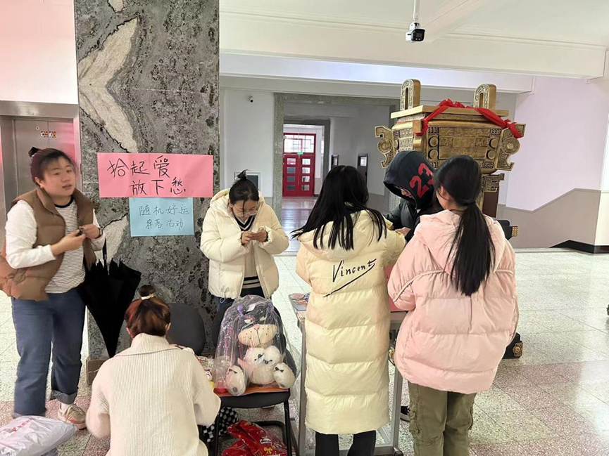 于2023年11月22日在理化楼2楼大厅成功开展“拾起爱,放下愁”——随机好运掉落活动。本次活动由沈天琪、谭晓玲、王泽同学主持,共有97位参与者。