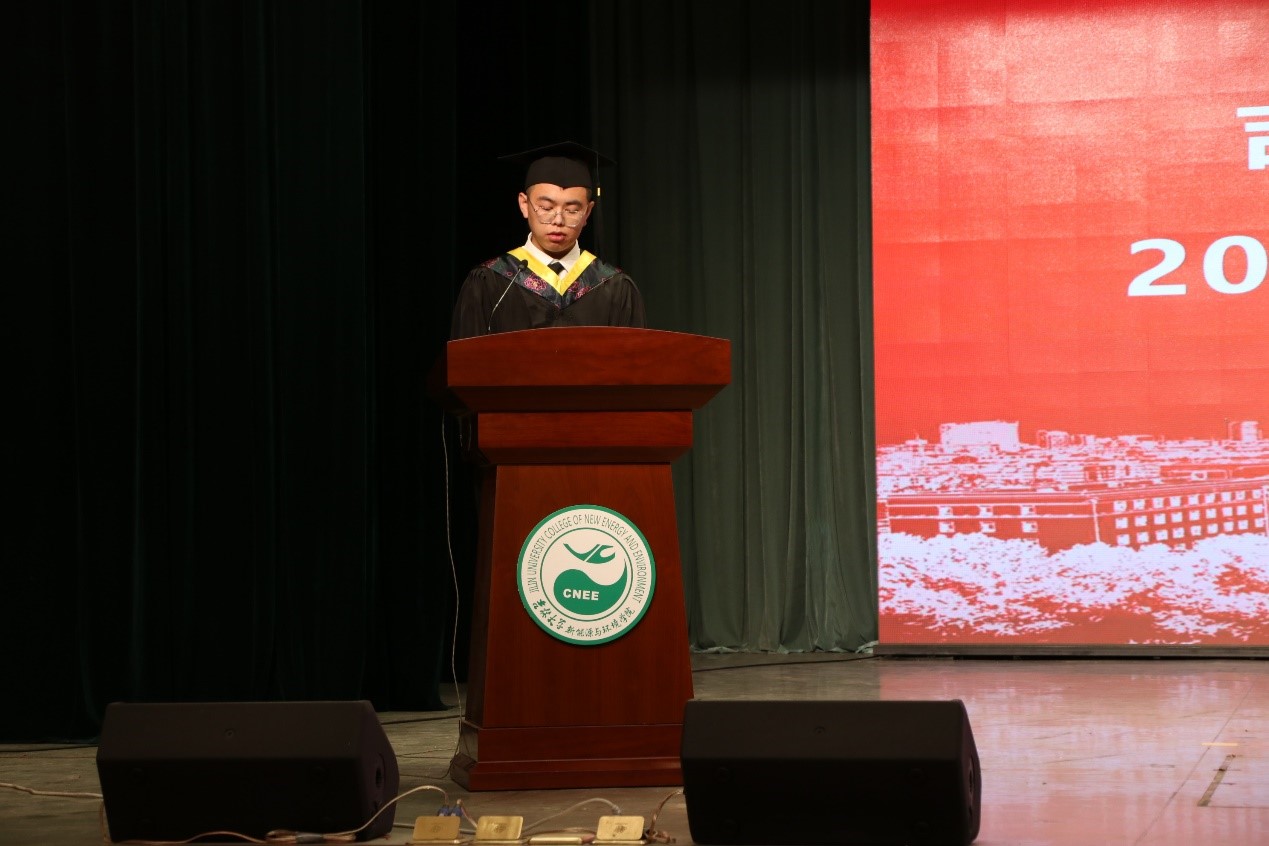 毕业本科生代表李春瑞发言,他表示会深刻铭记母校所教会的求实创新、励志图强的精神,铭记身为地学人的果敢坚毅、顽强拼搏。不论走到哪里,都会在未来的人生中,创造属于自己的价值,用实际行动讲好吉大故事,传承吉大精神!