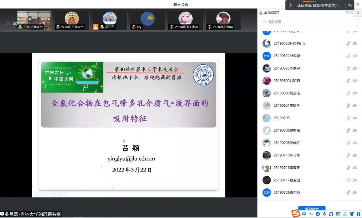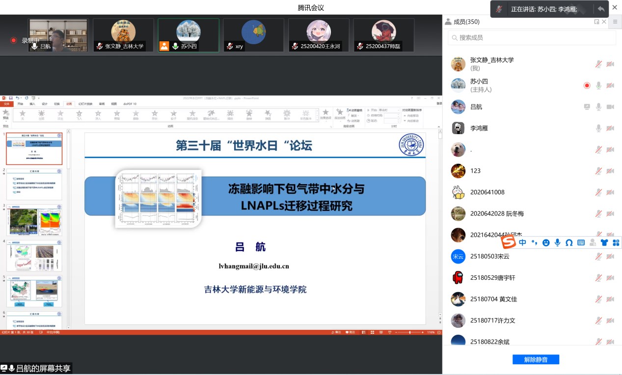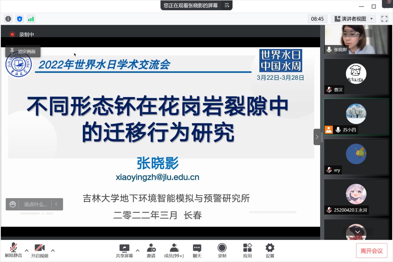院长许天福教授简要回顾了世界水日的由来和主旨,重点介绍了2022年世界水日和中国水周的活动主题。其后,王福刚教授、冯右骖副教授、吕航副教授、吕颖副教授、张晓影副教授、王宇博士和路莹副教授等7位中重点实验室青年骨干教师围绕寒旱区地下水资源形成与评价、包气带水分运动与污染质迁移转化、花岗岩裂隙中核素迁移、城市海绵城市雨洪过程和流域非点源污染过程模拟、地下水人工补给等主题汇报了各自近年来取得的最新进展,与参会师生进行了积极互动和深入交流。最后,苏小四教授对本次学术交流活动进行了总结。