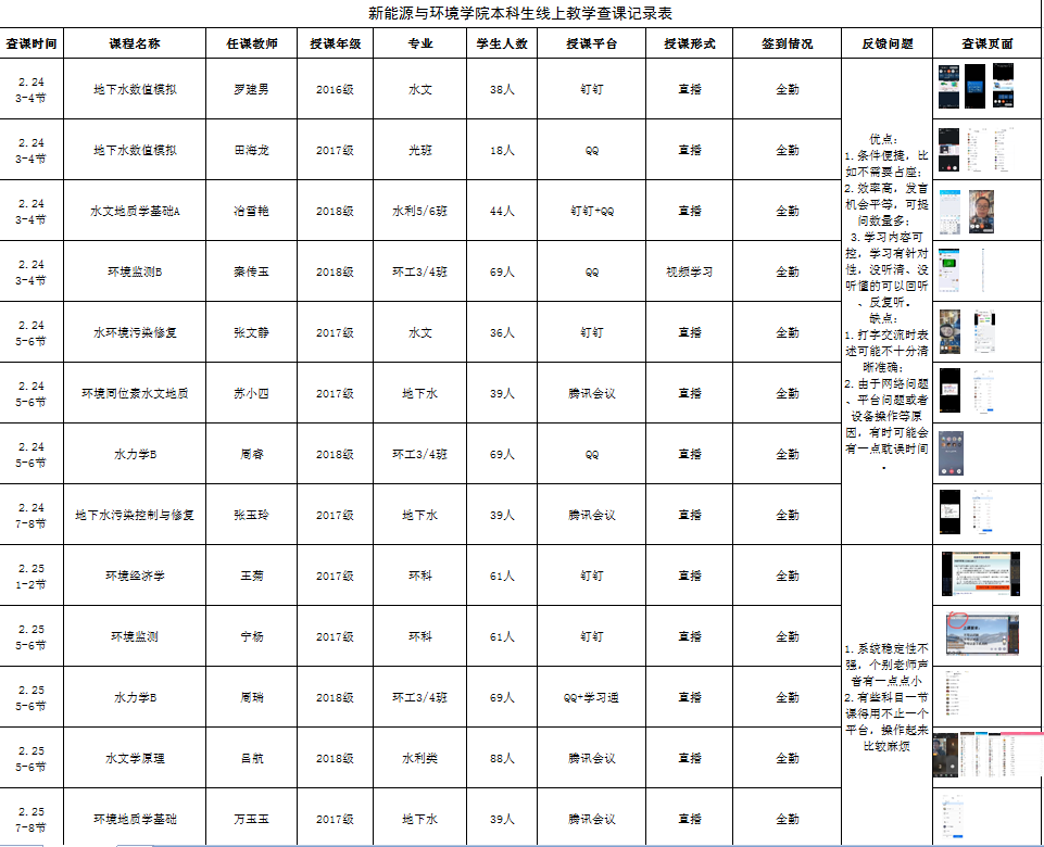 每一个网络课堂,在QQ、钉钉、腾讯会议3个平台全天各时段进行网络查课,共计查课13节,顺利完成教学检查任务。及时联络学生,保证全勤出席,密切关注学生在线学习情况及上课质量。课后与学生交流了在线上课的体验,很多同学对于这种新颖、高效、有针对性学习方式的点赞,比如:“条件便捷,不需要占座”“学习模式和生活模式转换效率高”“可以暂停记笔记,互动效果很好”“最喜欢的就是老师们录制的视频了,可以反复观看,哪里没听清能有处可寻,交给我们的资料更多了。我觉得更加便于交流,每位同学的发言机会平等,与老师沟通的战线拉长了”。当然,也存在一些问题:“打字没有线下表述问题那么清楚”“会有点浪费时间,QQ电话可能也会有bug加不进去”“有的科目一节课得用不止一个平台,操作起来比较麻烦”。学生工作办公室对学生网络学习的感受和建议进行了汇总,并及时向教学工作办公室反馈。