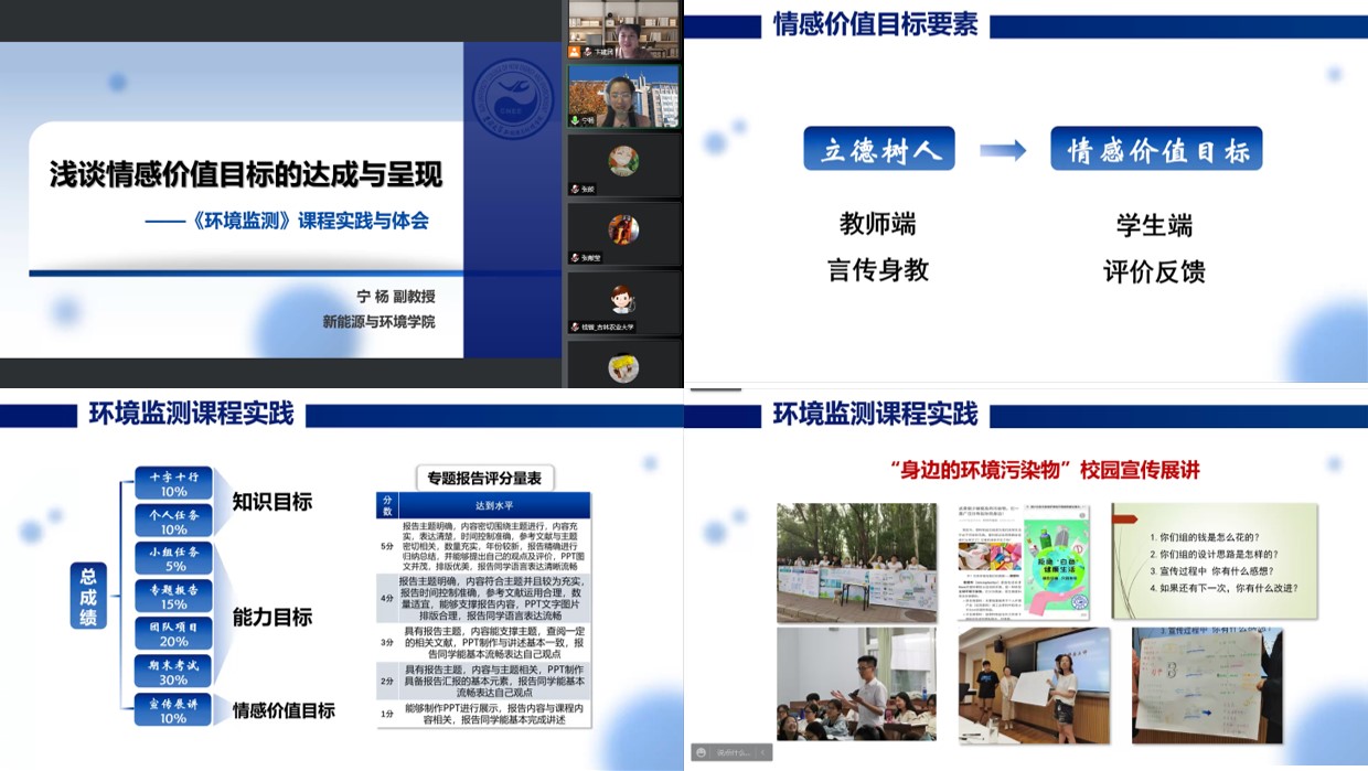 教师培训师宁杨副教授分别进行了题为“理工类课程思政设计与实践”和“浅谈情感价值目标的达成与呈现——《环境监测》课程实践与体会”的报告。会议由教学副院长卞建民教授主持。