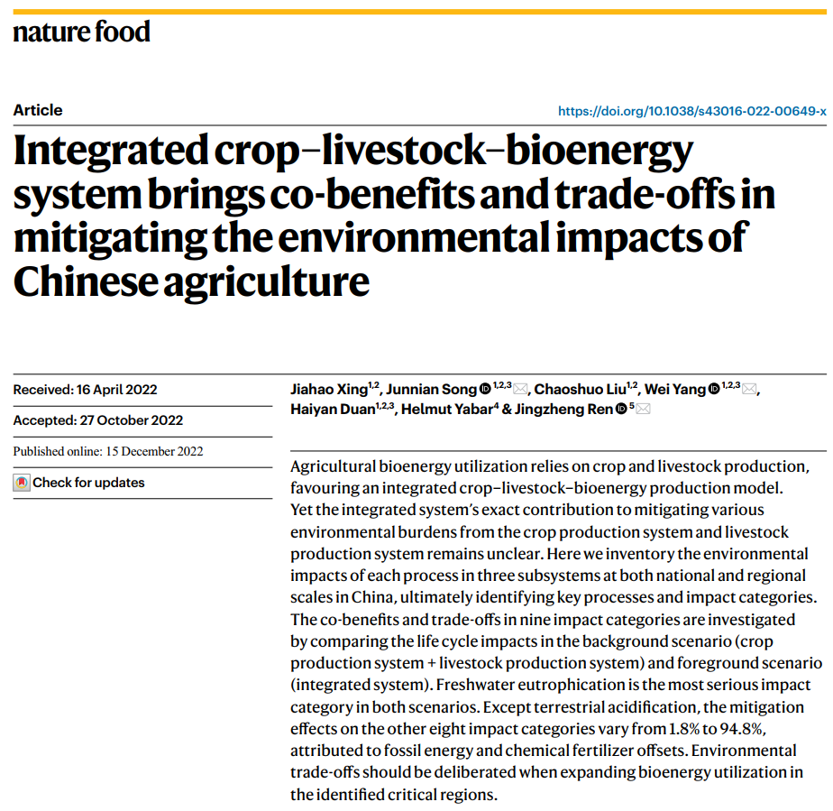 宋俊年教授研究团队领衔,与日本筑波大学、香港理工大学研究团队合作,在生物质能利用与农业环境影响研究领域取得重要进展,研究成果以“Integrated crop-livestock-bioenergy system brings co-benefits and trade-offs in mitigating the environmental impacts of Chinese agriculture”为题发表在农业与食物领域顶级期刊《Nature Food》。豪神娱乐城