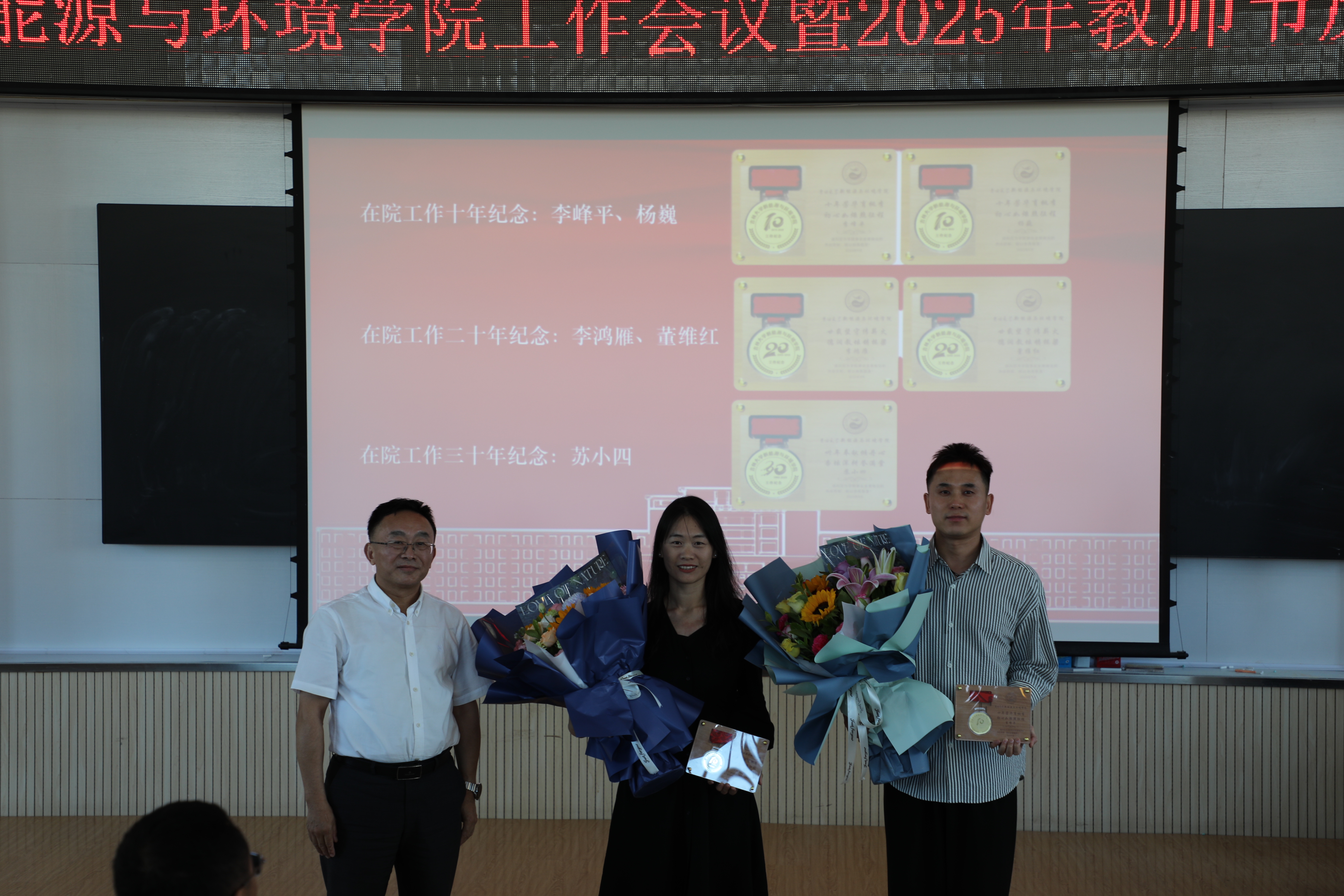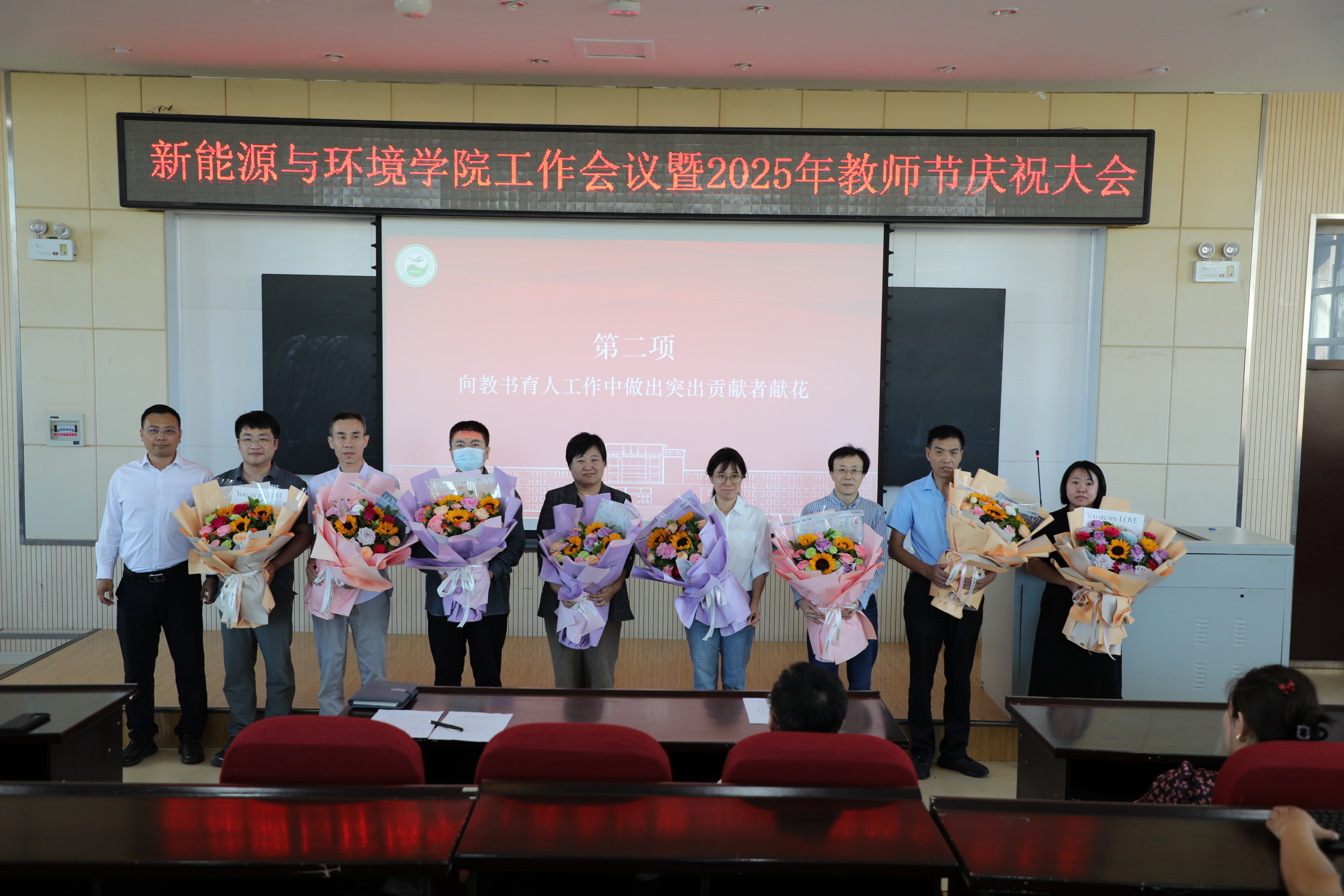 本科课堂教学质量奖(卓越奖)路莹、吉林省“十四五”普通高等教育本科省级规划教材代表迟子芳、中国科协青年人才托举工程博士生专项计划指导教师赵勇胜、优秀竞赛类指导教师:张春鹏、田海龙、袁益龙; 吉林省优秀博士论文指导教师董军、吉林省优秀硕士论文指导教师代表吕航等十位教师送上了鲜花。