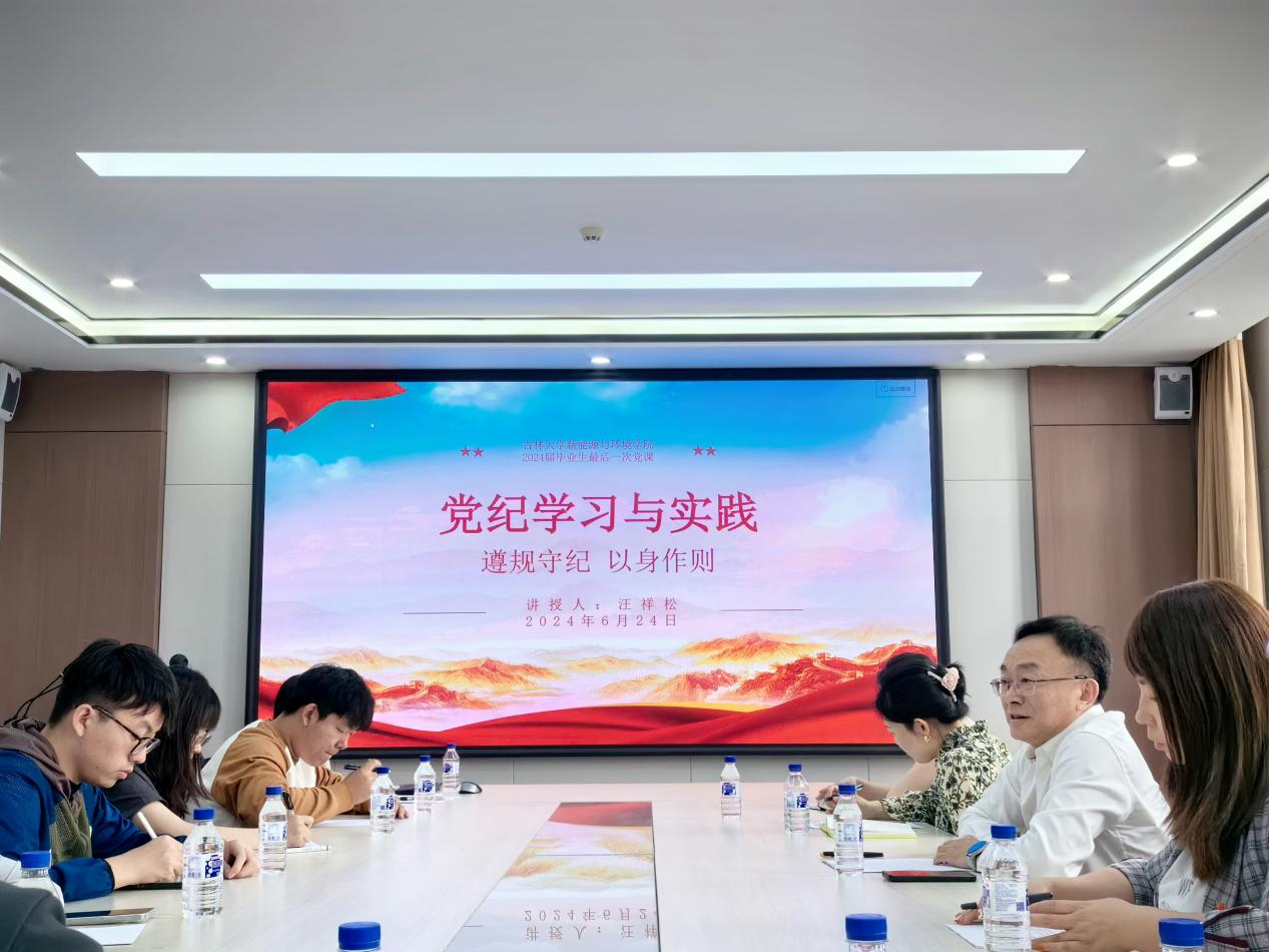党委书记汪祥松以“党纪学习与实践”为主题、以“遵规守纪,以身作则”为切入点,为2024届毕业生党员讲授毕业前最后一堂党课。各教工和学生党支部书记也相继讲授专题党课,进一步加强党支部政治建设和纪律建设,严明党的政治纪律和政治规矩,教育引导师生党员学纪知纪明纪守纪。